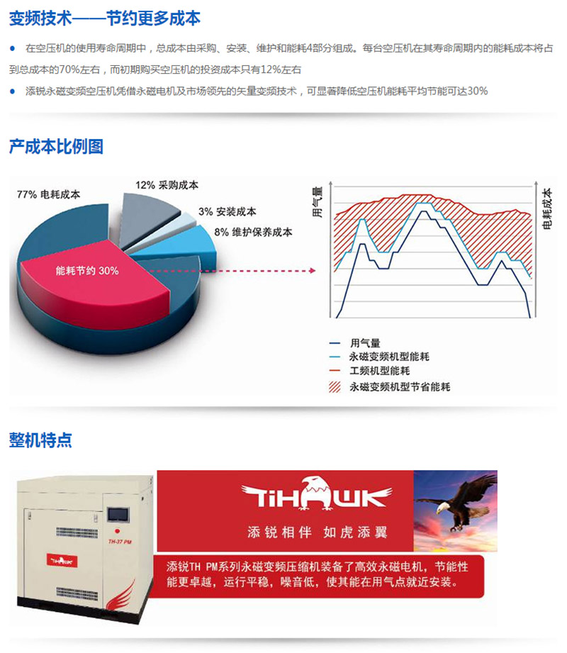 變頻技術(shù)——節(jié)約更多成本 ·在空壓機(jī)的使用壽命周期中,總成本由采購、安裝、維護(hù)和能耗4部分組成。每臺空壓機(jī)在其壽命周期內(nèi)的能耗成本將占到總成本的70%左右,而初期購買空壓機(jī)的投資成本只有12%左右 ·添銳永磁變頻空壓機(jī)憑借永磁電機(jī)及市場領(lǐng)先的矢量變頻技術(shù),可顯著降低空壓機(jī)能耗平均節(jié)能可達(dá)30%